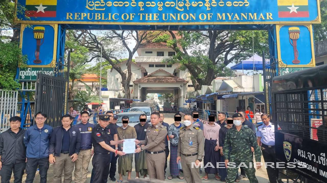 缅甸当局于今日(3月16日)上午,在缅泰1号友谊大桥,将藏匿在大其力市的7名泰国籍逃犯移交给泰国清莱府移民警察。