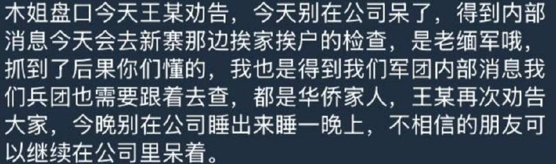 🎥曝光:#木姐 #新寨 #检查 木姐新寨晚上将大检查 木姐盘口今天王某劝告 今天别在公司呆了 得到内部消息今天会去新寨那边挨家挨户的检查 是老缅军哦 抓到了后果你们懂的 我也是得到我们军团内部消息我们兵团也需要跟着去查 都是华侨家人 王某再次劝告大家 今晚别在公司睡出来睡一晚上 不相信的朋友可以继续在公司里呆着 后续关注