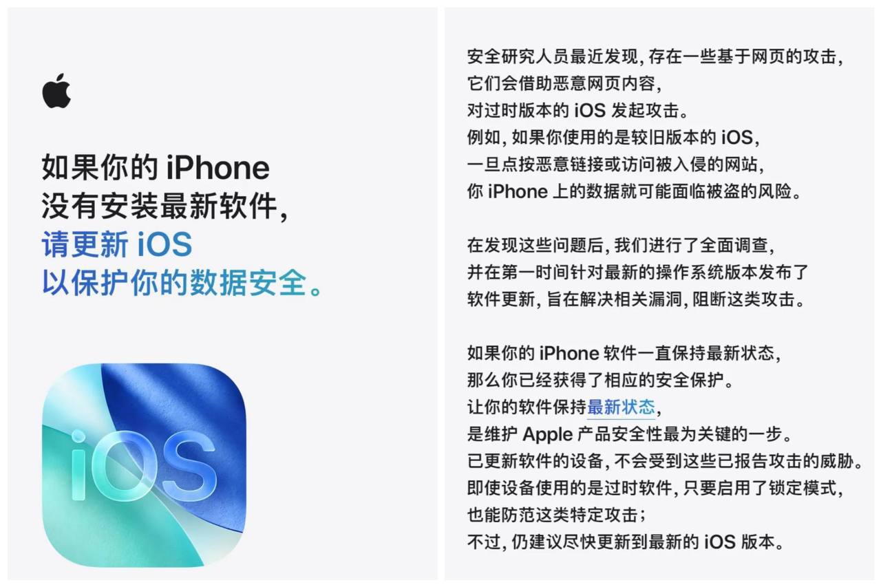 🎥曝光:#注意 最新紧急通知 苹果公司发文提醒iPhone用户 立即更新设备系统以保护你的iPhone免受网页攻击 苹果公司在公众号最新发文表示 安全研究人员最近发现 存在一些基于网页的攻击 它们会借助恶意网页内容 对过时版本的 iOS 发起攻击 例如 如果用户使用的是较旧版本的 iOS 一旦点按恶意链接或者访问被入侵的网站 iPhone上的数据就可能面临被盗的风险 在发现这些问题后 苹果进行了全面调查 并在第一时间针对最新的操作系统版本发布了软件更新 旨在解决相关漏洞 阻断这类攻击 如果用户的iPhone运行的是较旧版本的 iOS 请立即更新 无法更新设备的用户 如果设备支持 可考虑启用锁定模式 以防范恶意网页内容及其他威胁