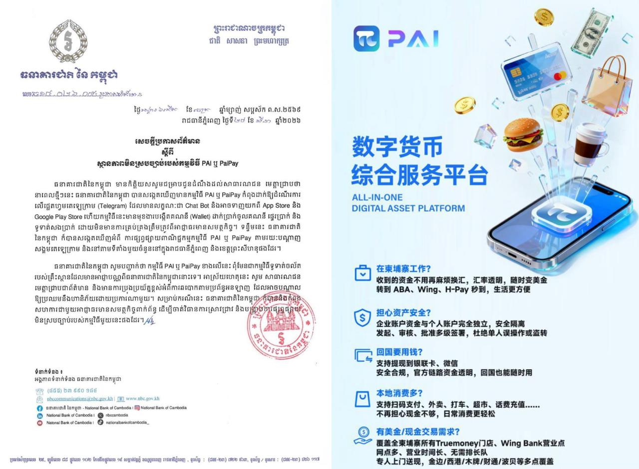 柬埔寨资讯 今天,柬埔寨国家银行(NBC)发布紧急公告,提醒公众警惕通过Telegram机器人、App Store及Google Play运行的名为“PAI”或“PaiPay”的应...