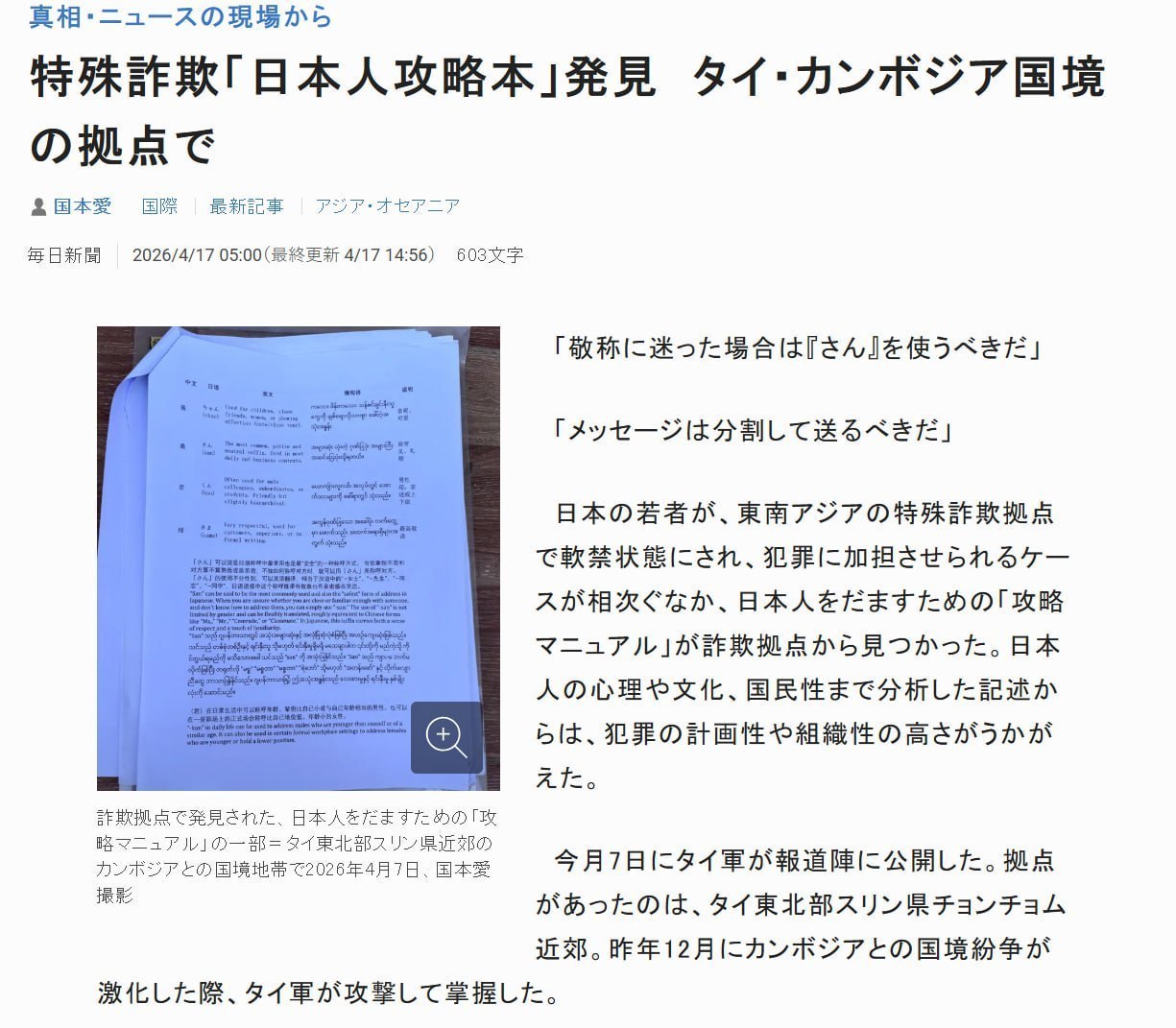 泰柬边境诈骗据点曝光:查获“针对日本人诈骗攻略手册”,犯罪组织高度专业化