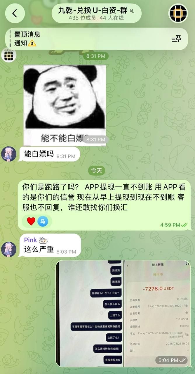 网友反馈:九乾换汇 九乾APP疑似跑路了,从早上提现到现在不到账 客服连一个毛都不回,用你们APP是看你们信誉 有实体店,就这格局以后谁敢找你们换汇!