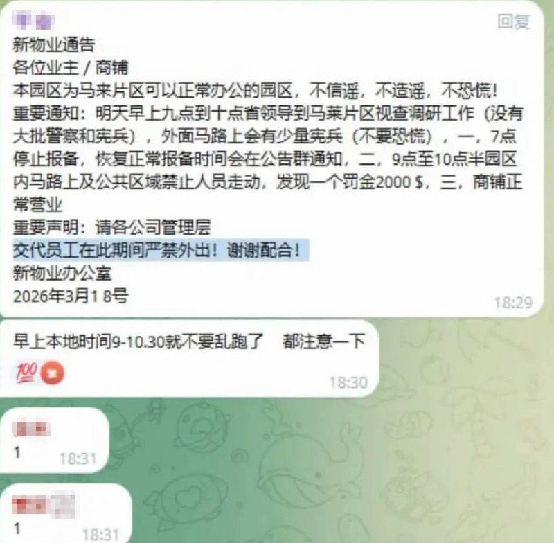#网友反馈:今天早上9点到10点省领导到马莱片区视查调研工作(没有大批警察和宪兵),外面马路上会有少量宪兵(不要恐慌)