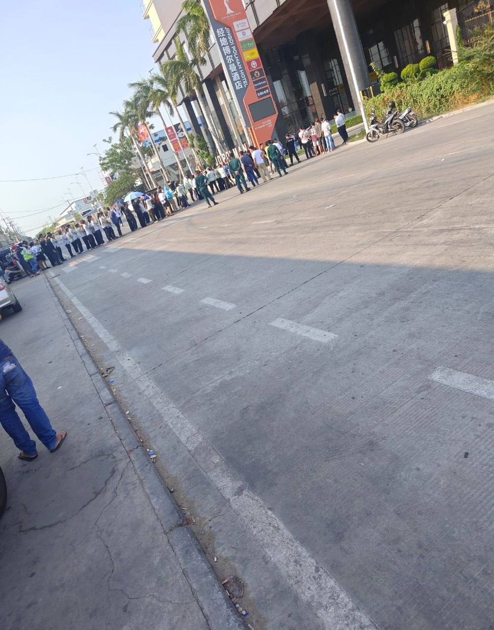 #网友反馈:前几天金边被查的铂尔曼酒店!目前老板不给发工资,一群员工暴乱抗议,现在宪兵把路这条路封了,不让任何车过