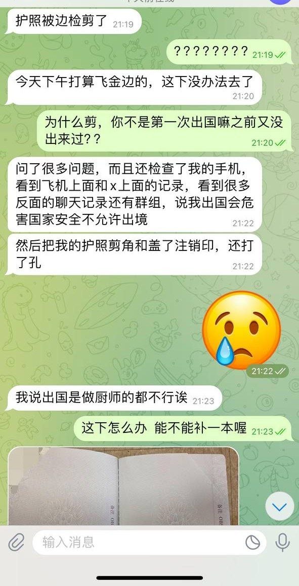 我朋友今天去海关准备来柬埔寨。她都没出过国,在边检检查手机的时候看到tg这些群组了,直接把她护照剪掉,不允许出境,估计短时间内护照都没办法补办了!!