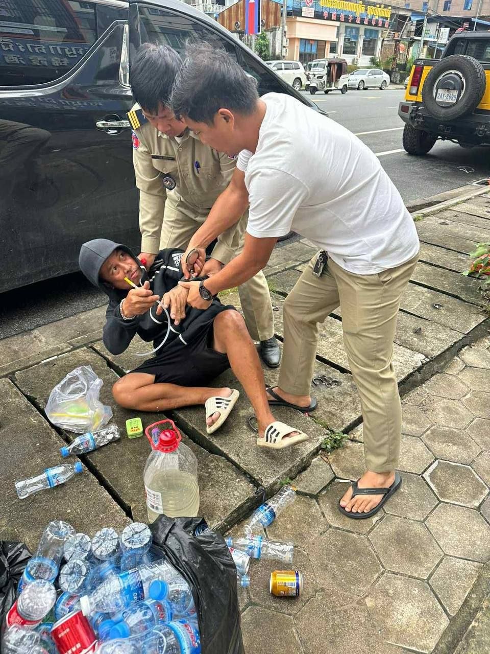 群友投稿:大哥在西港当街头嗨毒,应该是精神有问题,大街上摆弄那些吸毒工具,警察已经带走了,刚刚的事。