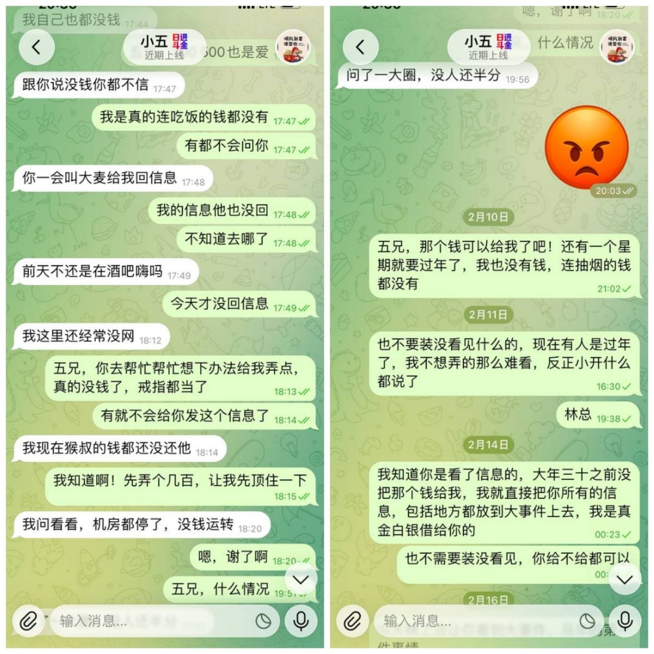 还有公司大麦组长,现在是在西港,改名阿凯,现在给足你面子了,欠我6000u,有钱不还,请我身边的兄弟去开包厢,打钱回家,还别人钱,带着老婆去旅行就是不还我钱,当初借你的时候,你是怎么说的?