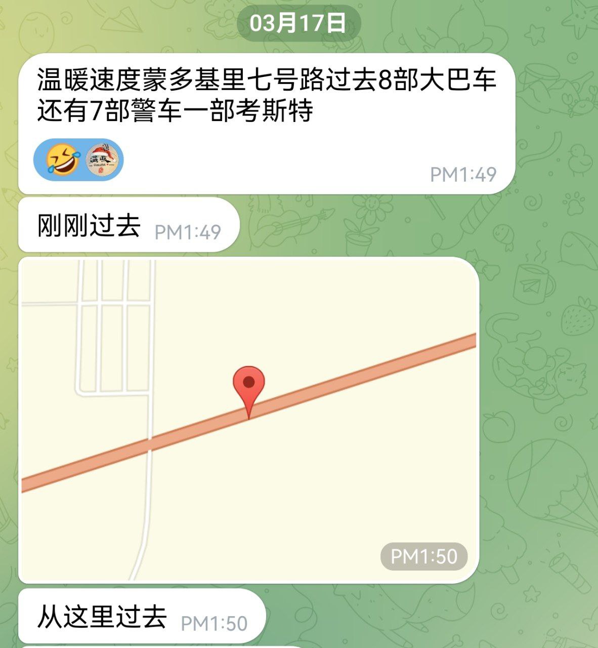 群友爆料:🇰🇭木牌往8号路的方向那边,刚刚在20分钟之前有19台大巴车4台警车,径直往智慧园区方向去了,不知道是去7号路大检查还是执行警车押运任务。