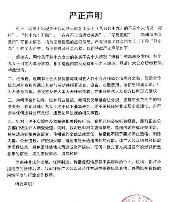 近日,网上流传其“90万陪睡”、不正当男女关系、学历造假、新疆演唱会募资等虚假信息,严重损害名誉。4月8日,其所属陕西宜利诚文化传媒有限公司发布严正声明,澄清所有内容均为捏造,韩小九目前单身,并已向公安机关报案,固定证据,将依法追究造谣者及传播者全部法律责任。