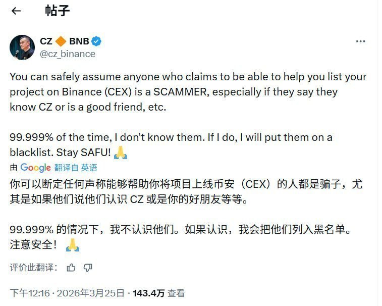 赵长鹏发文提醒声称可代办币安上币均为骗局