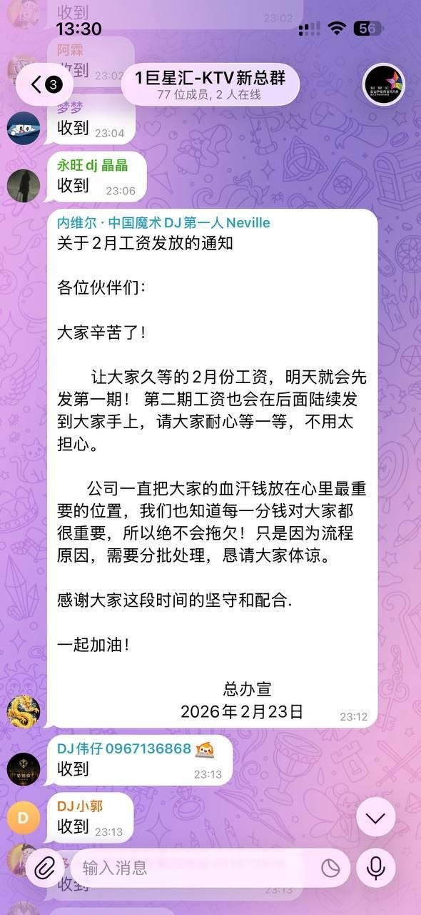 群友爆料:西港永旺(巨星汇ktv )从去年开始就多次拖欠员工工资,在拖欠工资的情况下,我们一直和公司共度难关,期间遇到检查好多次,还有同事和客人被抓了。