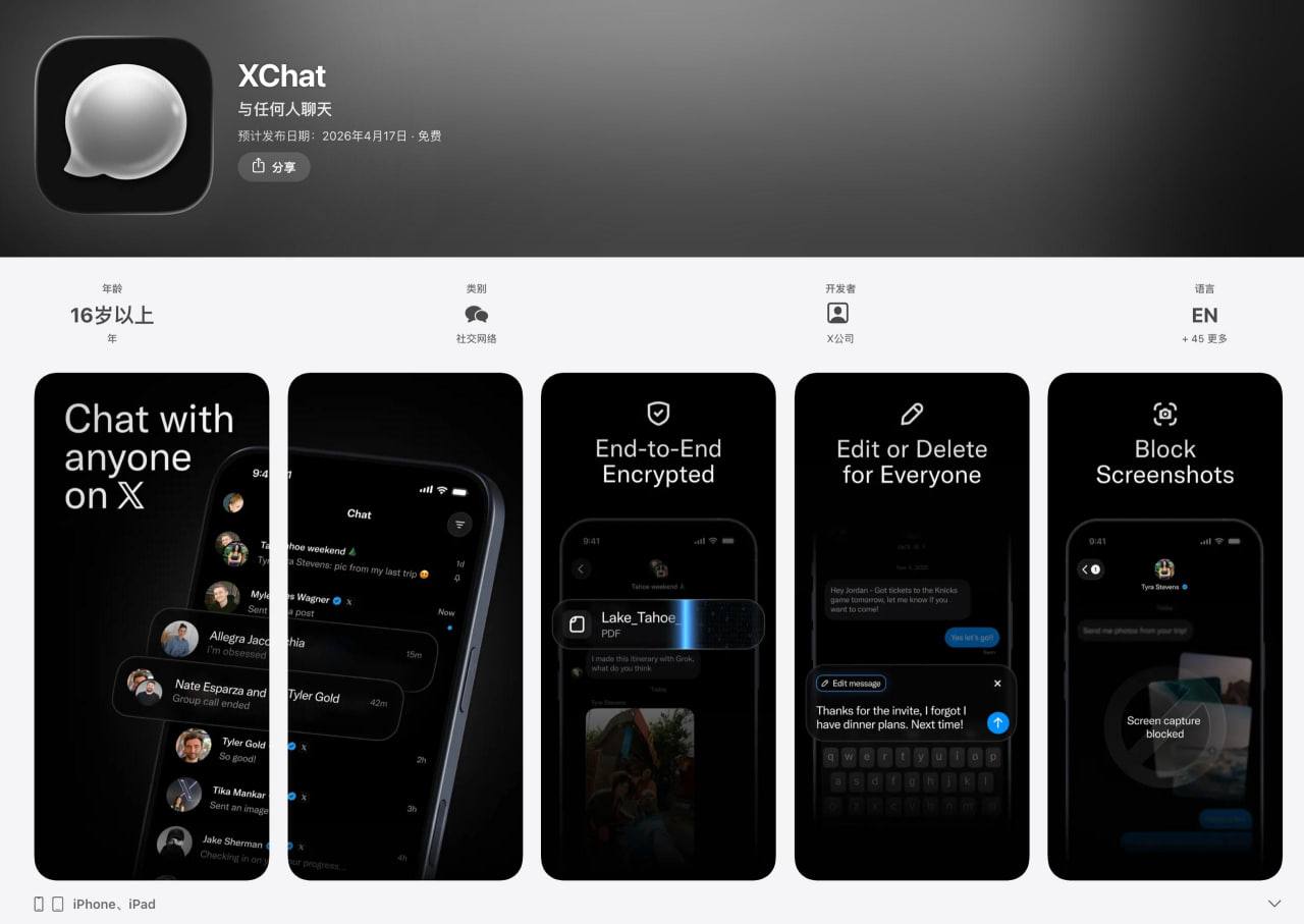 马斯克 的 #XChat App 将于4月17日在 iOS 平台推出