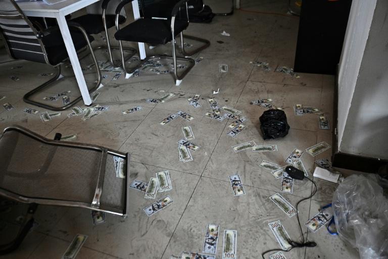 法新社报道:奥斯玛的皇家山庄园区狗推在泰国轰炸前逃跑,留下一地假的美钞。